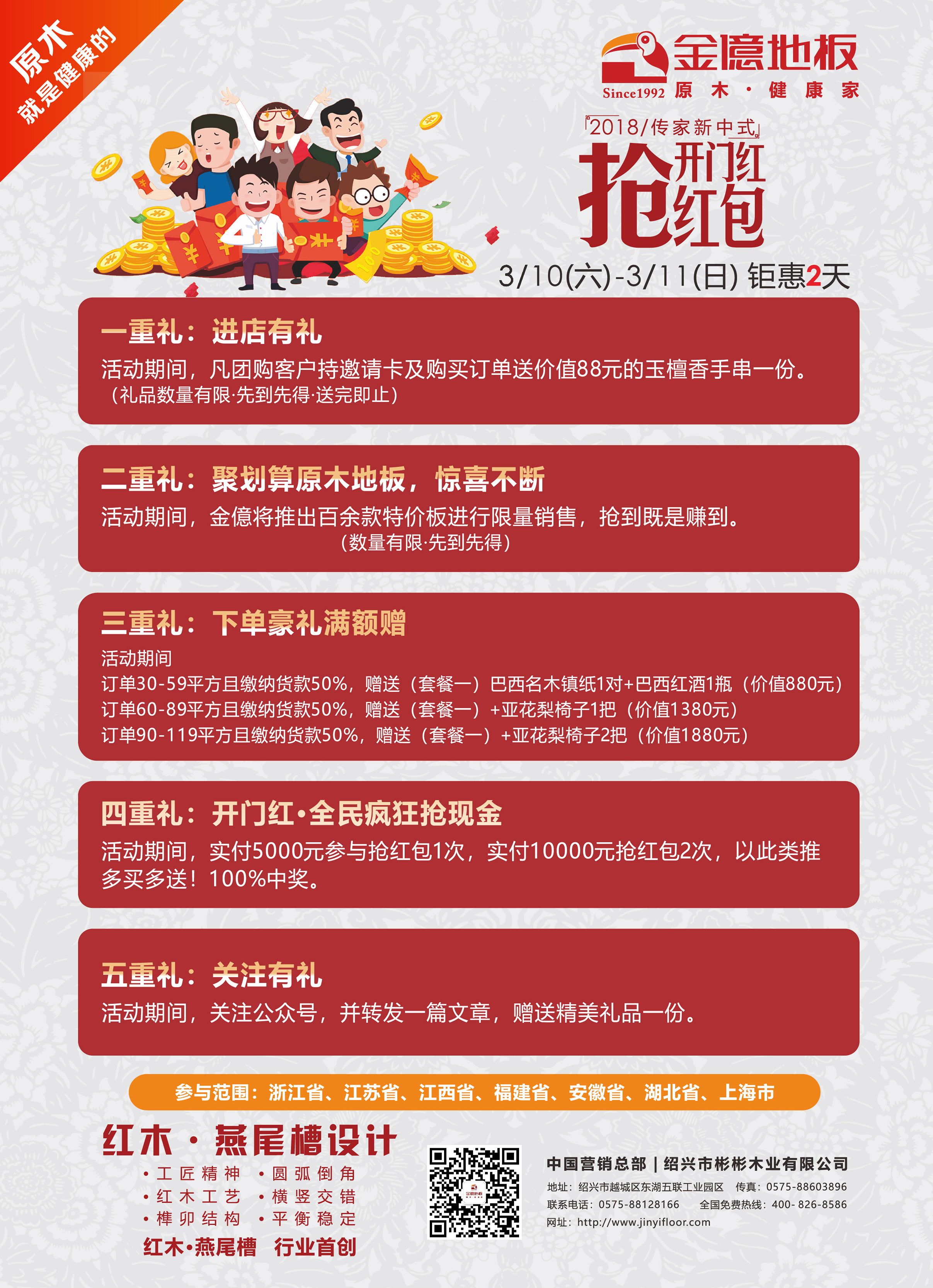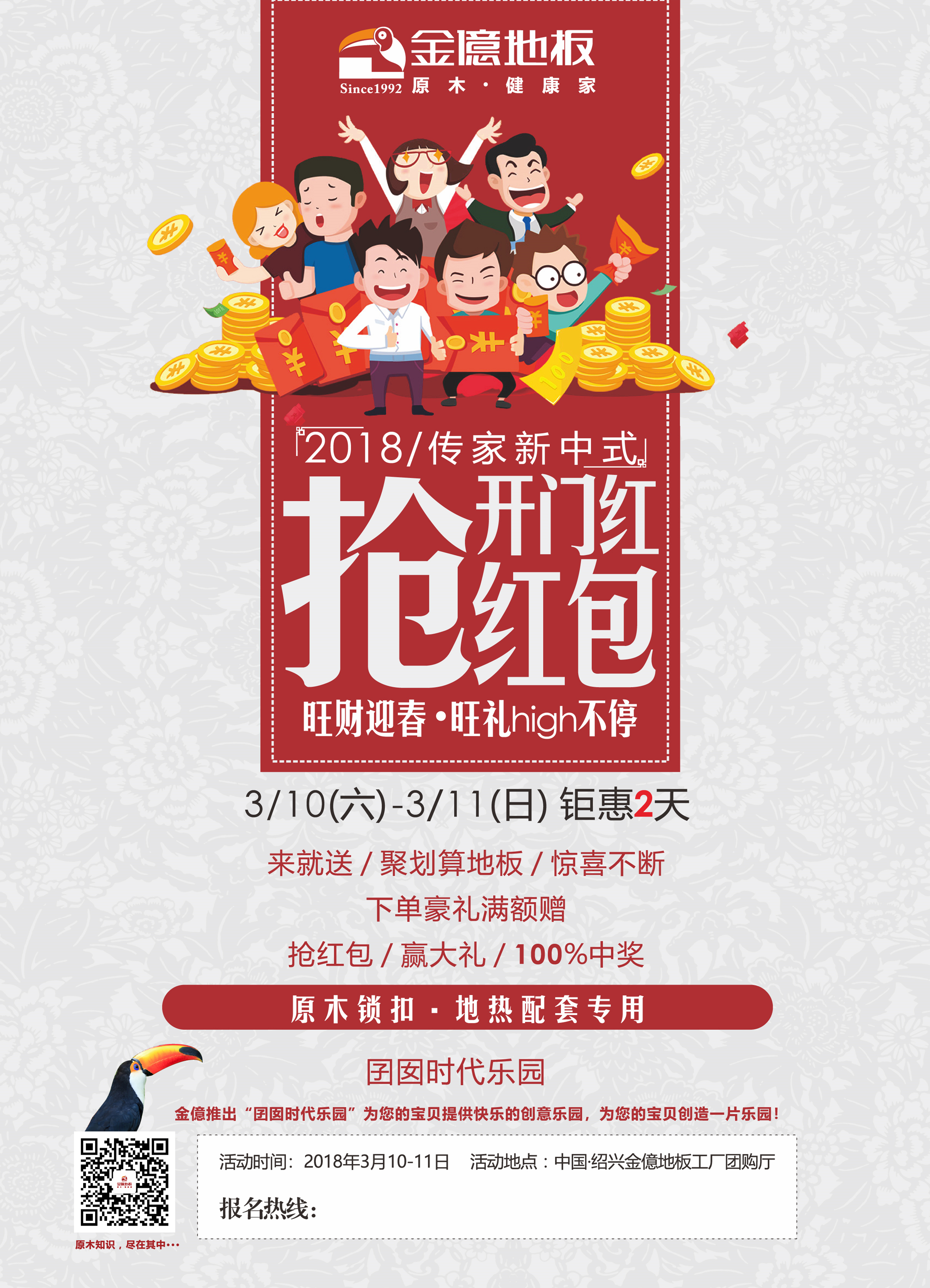 时间一晃而过,过完了热热闹闹的春节,我们又迎来了新的一年工作之中。2018年,撸起袖子,加油干! 3月拼搏官方网站_拼搏(中国)股份有限公司地板工厂团购活动 “开门红-抢红包 旺财迎春,旺礼high不停” 如约而至。